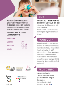 Les ateliers créatifs de l’Association S5, l’ASPEDA et A-CAPELLA offrent aux enfants sourds ou malentendants un espace rien qu’à eux pour imaginer, bricoler, explorer, rire et s’exprimer librement. Ici, chaque activité devient une aventure, chaque thème une découverte, et chaque enfant trouve sa place dans un environnement pensé pour lui, en langue des signes et en toute bienveillance.