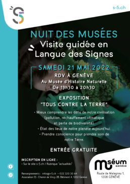 Rendez-vous au Musée d’histoire naturelle le samedi 21 mai de 19h30 à 20h30 pour une visite nocturne en langue des signes autour de l’exposition « Tous contre la terre » Évènement GRATUIT ! Inscription nécessaire Billetterie Weezevent PrécédentSuivant