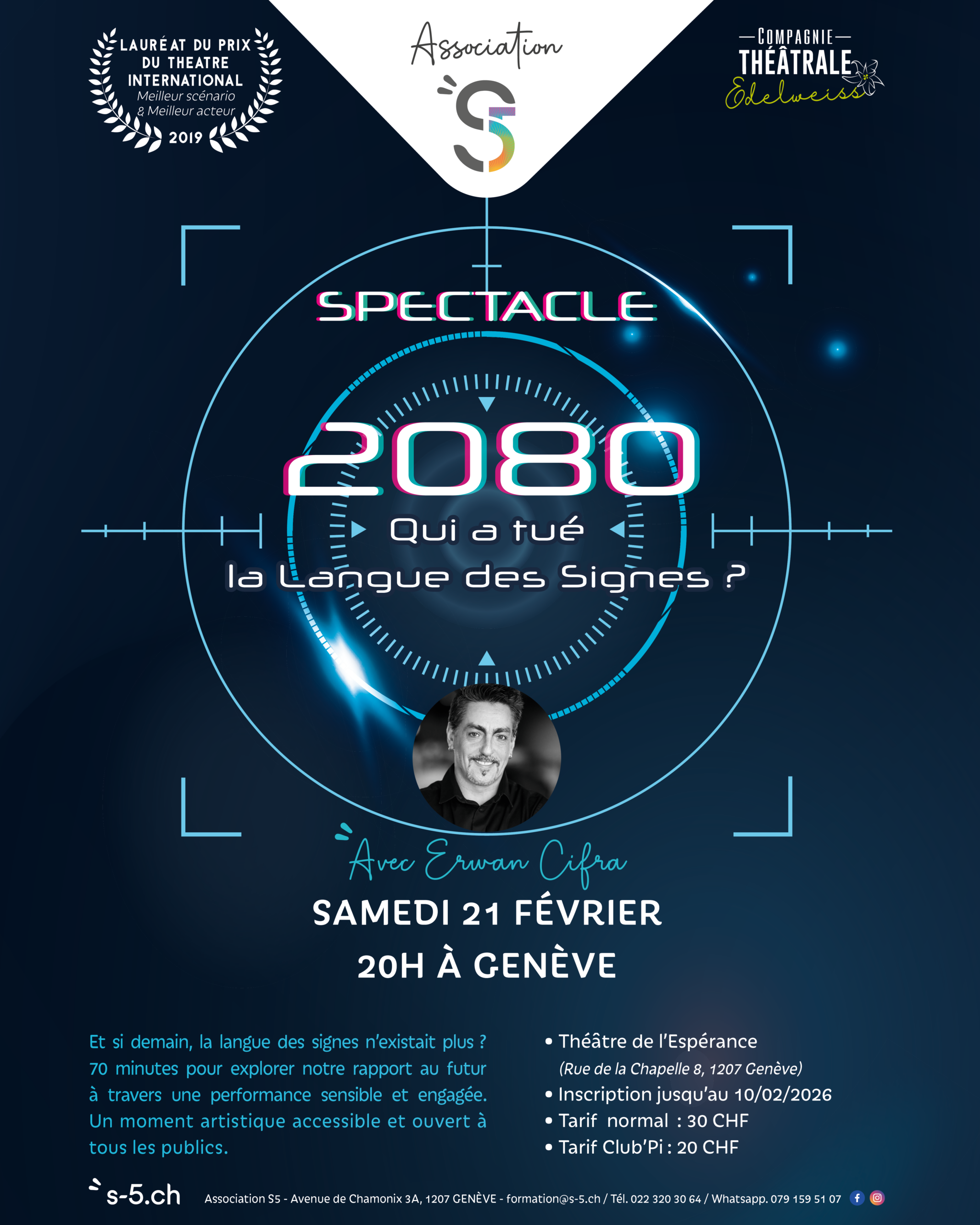 2080 – Qui a tué la Langue des Signes ? nous plonge dans une anticipation troublante et profondément humaine. À travers une performance sensible et engagée, le spectacle interroge notre rapport au progrès, à la mémoire et à l’effacement des cultures. Seul en scène, Erwan Cifra donne corps à une réflexion puissante où l’émotion, le silence et le langage se répondent. Une expérience artistique forte, accessible à toutes et tous, qui bouscule, questionne et laisse une empreinte durable bien après le dernier instant