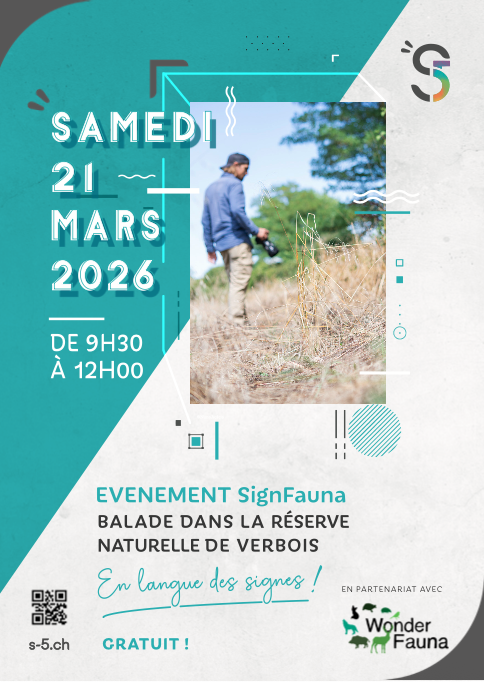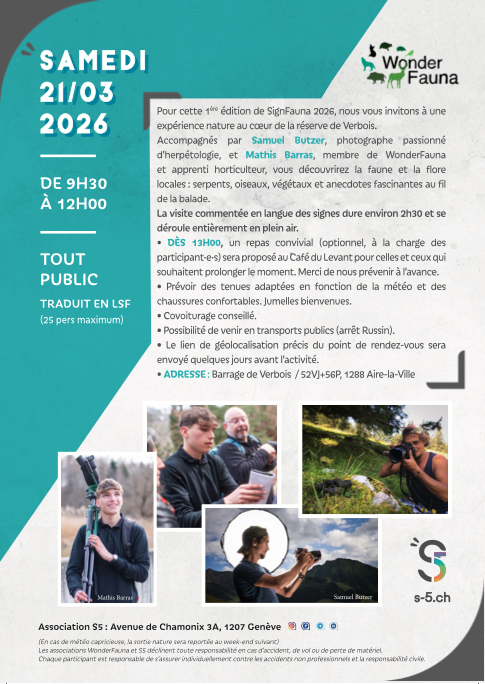 L’Association S5 organise un événement SignFauna en partenariat avec WonderFauna : une balade nature dans la réserve de Verbois, entièrement traduite en langue des signes. Accompagnés par un photographe spécialisé en herpétologie et un membre de WonderFauna, les participant·es découvriront la faune et la flore locales — serpents, oiseaux, végétation — ainsi que des anecdotes naturalistes tout au long du parcours.